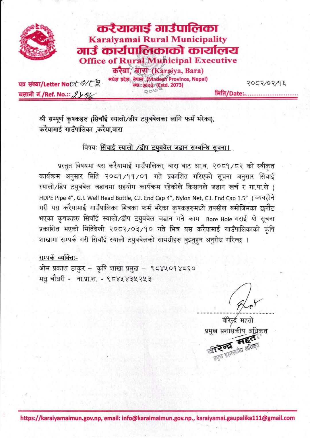 यसका लागि किसानहरूले यसअघि फारम भरेका र छनोटमा परेका लाभग्राहीहरूले सम्बन्धित वडा कार्यालयबाट जानकारी प्राप्त गरी कृषि शाखामा सम्पर्क गर्न सूचित गरिएको छ।