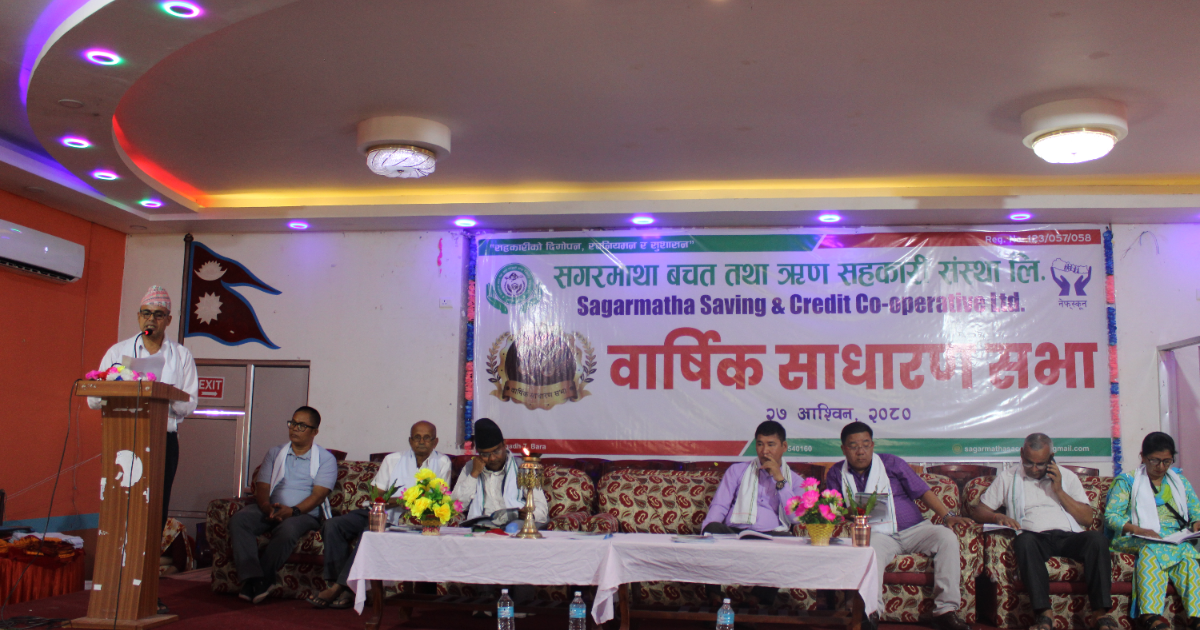 बाराको निजगढ–७ स्थित सगरमाथा बचत तथा ऋण सहकारी संस्था लिमिटेडको २४ औं वार्षिक साधारण सभा कार्यक्रमको उद्घाटन गर्दै सचिव चौलागाईले बचत तथा ऋण सहकारीले बचतलाई प्राथमिकता दिनुपर्ने बताए । नियमित र अनिवार्य बचत गर्नुपर्ने बताए ।
