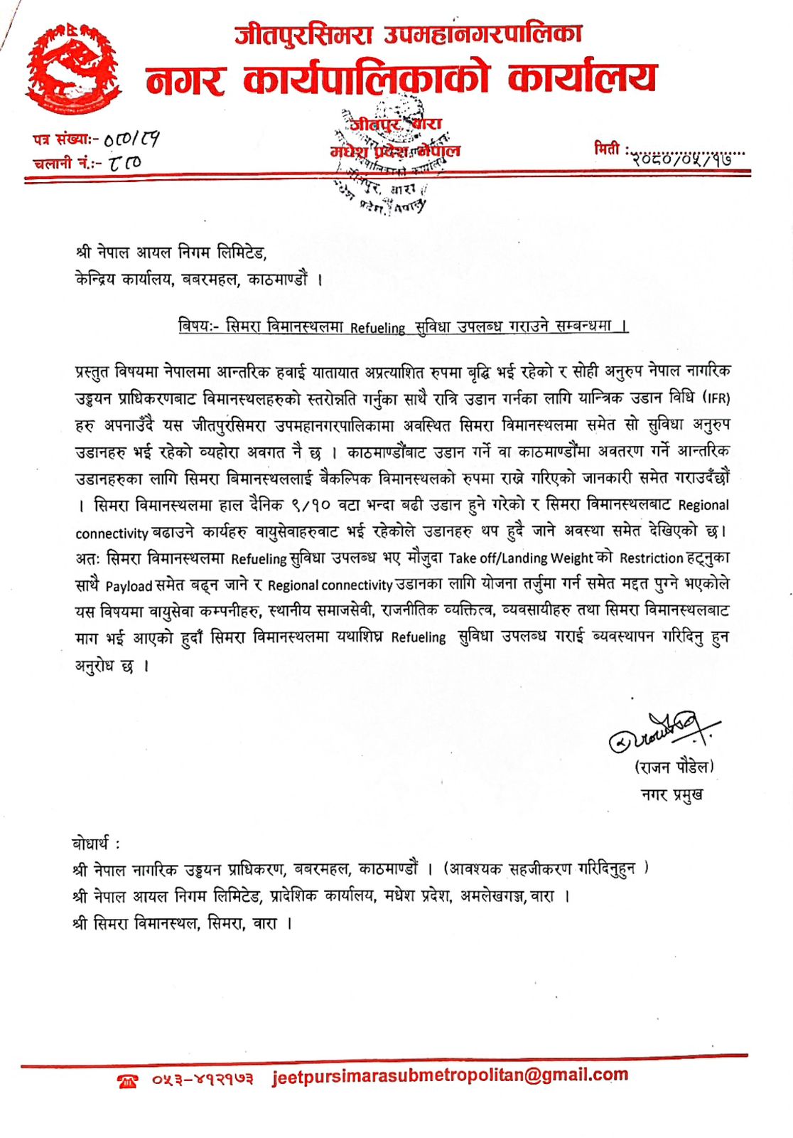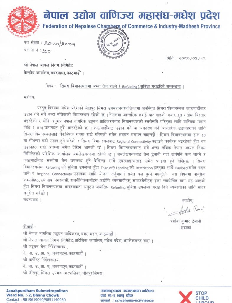 देशकै पुरानो विमानस्थलमध्येको एक सिमरा विमानस्थलमा हवाइ इन्धन भर्ने डिपो स्थापनाका लागि माग हुँदै आएको थियो । इन्धन भर्ने सुविधा नहुँदा काठमाडौंमा मौसम र ञएयर ट्राफिकका कारण अवतरण गर्न नसकेका जहाज भैरहवा र विराटनगर डाइभर्ट हुँदै आएका थिए ।