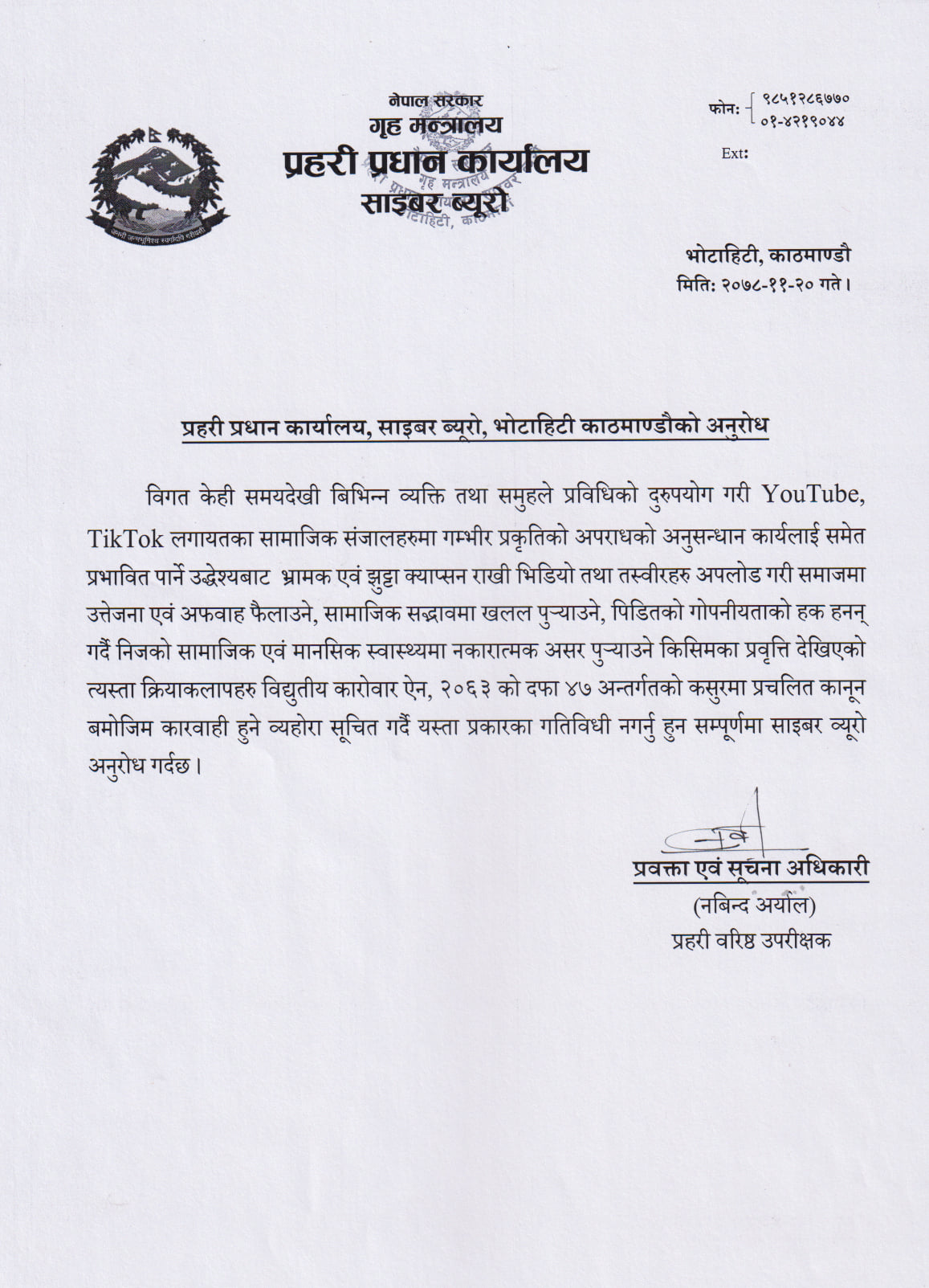 केही समयदेखि विभिन्न व्यक्ति तथा समूहले प्रविधिको दुरुपयोग गरी युट्युब, टिकटकलगायतका सामाजिक सञ्जालहरुमा गम्भीर प्रकृतिको अपराधको अनुसन्धान कार्यलाई समेत प्रभावित पार्ने उद्देश्यबाट भ्रामक एवं झुटा क्याप्सन राखी भिडियो तथा तस्बिरहरु अपलोड गरी समाजमा उत्तेजना एवं अफवाह फैलाउने काम भइरहेको छ,’ साइबर ब्युरोले विज्ञप्ति जारी गर्दै भनेको छ, ‘सामाजिक सद्‍भावमा खलल पुर्‍याउने, पीडितको गोपनीयताको हक हनन् गर्दै निजको सामाजिक एवै मानसिक स्वास्थ्यमा नकारात्मक असर पुर्‍याउने किसिमका प्रवृत्ति देखिएको त्यस्ता क्रियाकलापहरु विद्युतीय कारोवार ऐनअन्तर्गतको कसुरमा प्रचलित कानुनबमोजिम कारवाही हुने व्यहोरा सूचित गर्दै यस्ता प्रकारका गतिविधि नगर्नु हुन सम्पूर्णमा साइबर व्युरो अनुरोध गर्दछ।’