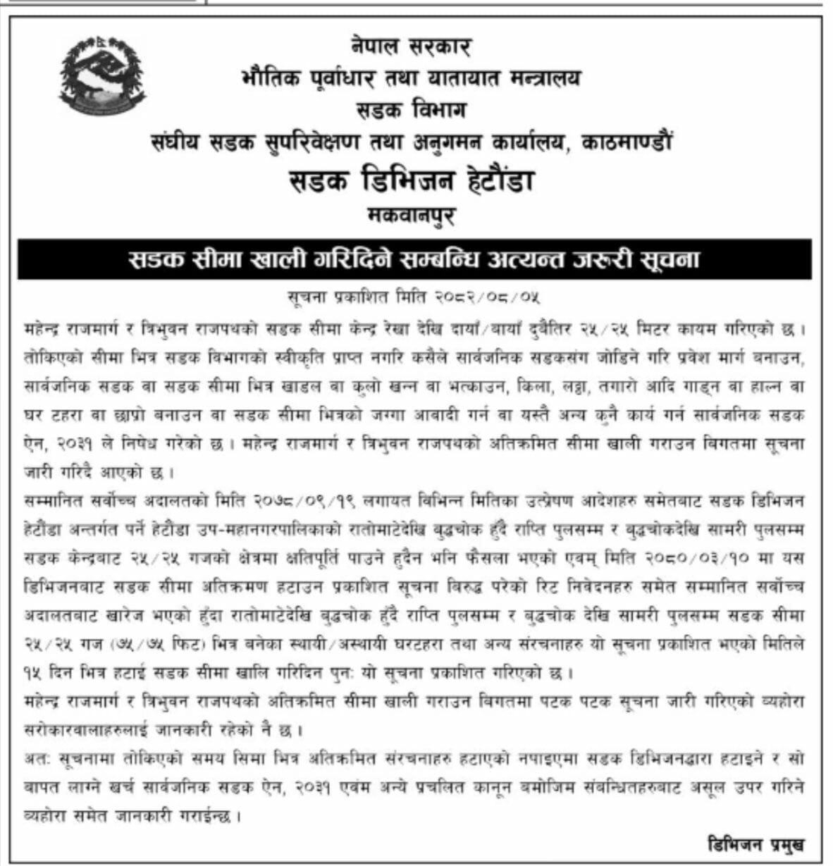काठमाडौँ-सडक डिभिजन हेटौँडाले महेन्द्र राजमार्ग र त्रिभुवन राजपथको सडक सीमा केन्द्र रेखा देखि दायाँ बायाँ दुवैतिर २५ र २५ मिटर कायम गरिएकोले सो क्षेत्रभित्र पर्ने संरचना हटाउन आग्रह गरेको छ ।