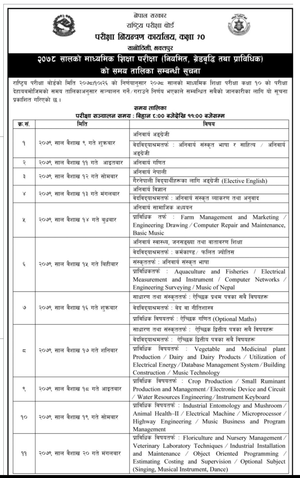 तालिका अनुसार आगामी वैशाख ९ गते परीक्षा हुने भएकाे छ ।
