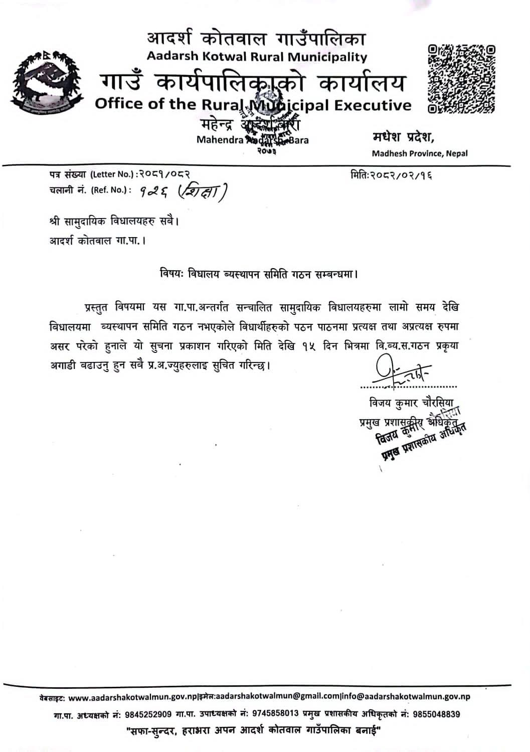 प्रमुख प्रशासकीय अधिकृत विजय कुमार चौधरीले हस्ताक्षर गरेको उक्त पत्रमा समितिहरू गठन भएपछि विद्यालयमा पठनपाठन तथा अन्य क्रियाकलापहरू सहज रूपमा सञ्चालन हुने अपेक्षा गरिएको छ ।