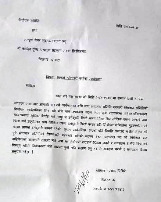 उपाध्यक्ष पदका उम्मेदवार गोविन्द प्रसाद घिमिरेले शुक्रबार एक पत्र बुझाउँदै उम्मेदवार नरहने र चुनाव चिन्ह समेत उपलब्ध नगराउन भन्दै स्वघोषणा गरेका छन् ।
