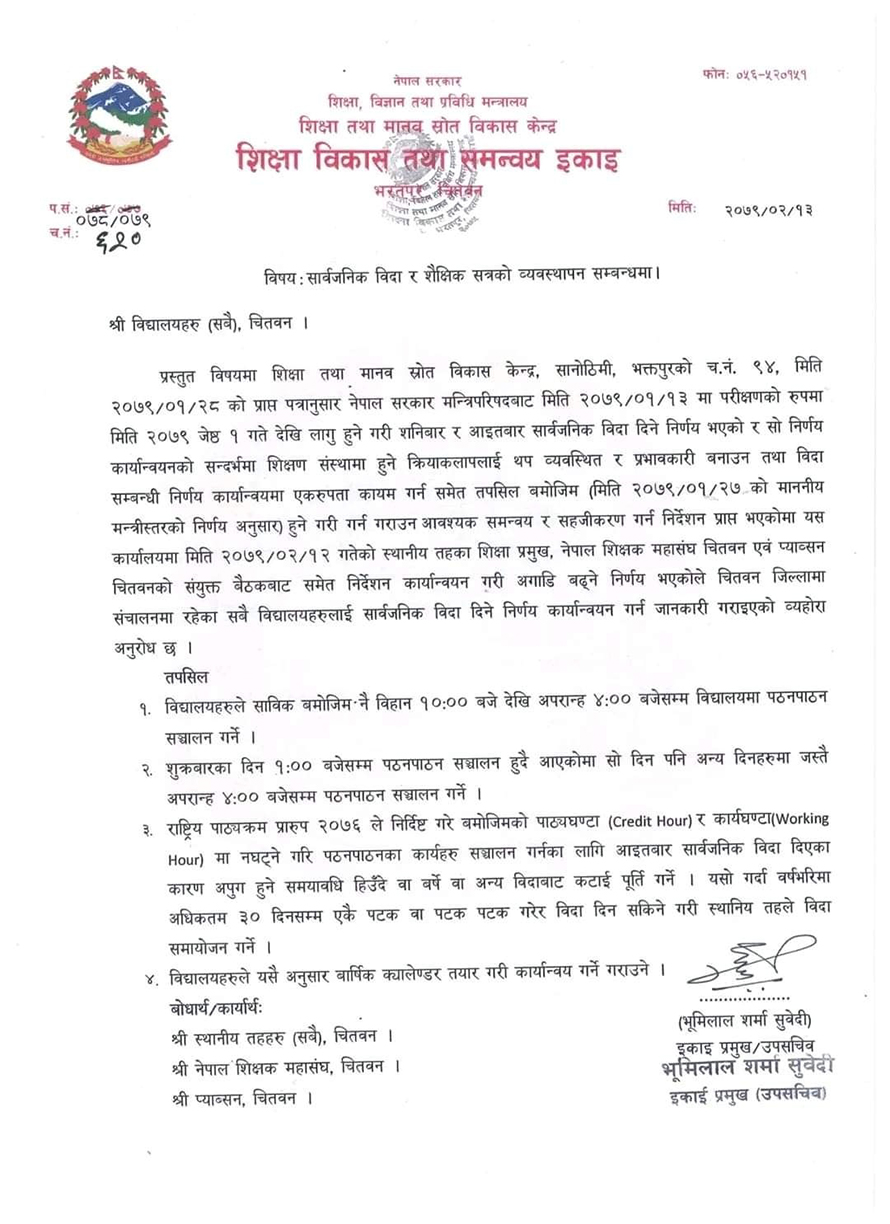 चितवनका विद्यालयमा हप्ताको दुई दिन विदा