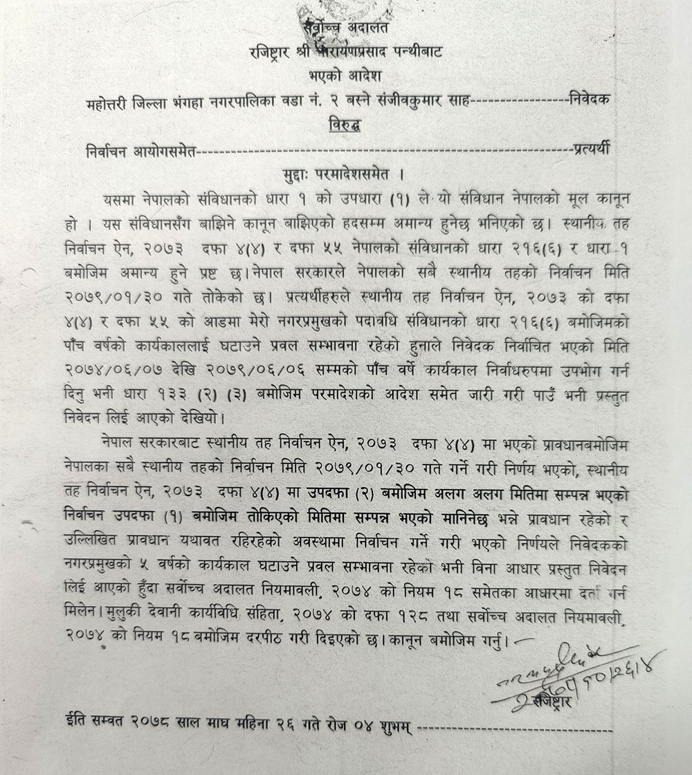 महोत्तरीको भंगाहा नगरपालिकाका मेयर सन्जिवकुमार साहले आफूहरूले ५ वर्षे कार्यकाल उपभोग गर्न नपाउने भन्दै रिट विनेदन लिएर गएकोमा सर्वोच्चले दर्ता गर्न अश्वीकार गरेको हो ।