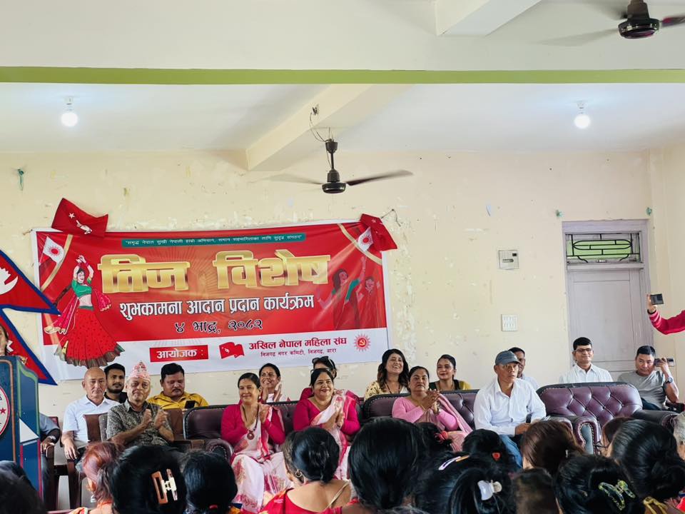 बारा–अखिल नेपाल महिला संघ निजगढ नगर कमिटीले ‘समृद्ध नेपाल, सुखी नेपाली, हाम्रो अभियान समान सहभागिताका लागि सुदृढ संगठन’ भन्ने मूल नाराका साथ तीज पर्वको अवसर पारेर शुभकामना आदान–प्रदान कार्यक्रम सम्पन्न गरेको छ।