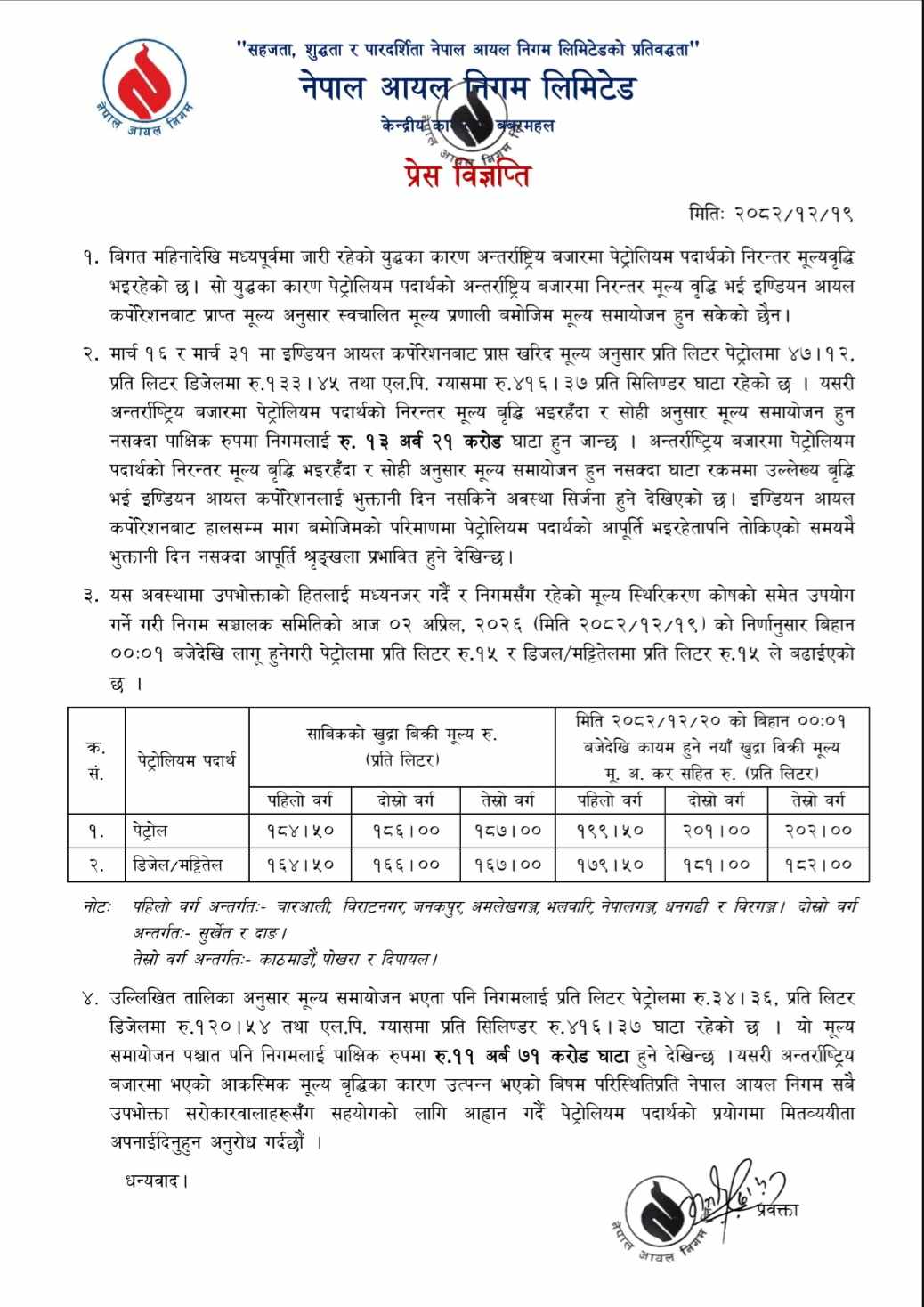 चैत २० गते (अहिले मध्यरात) बिहानैदेखि लागु हुनेगरी आयल निगमले मूल्यवृद्धि गरेको जनाएको छ ।