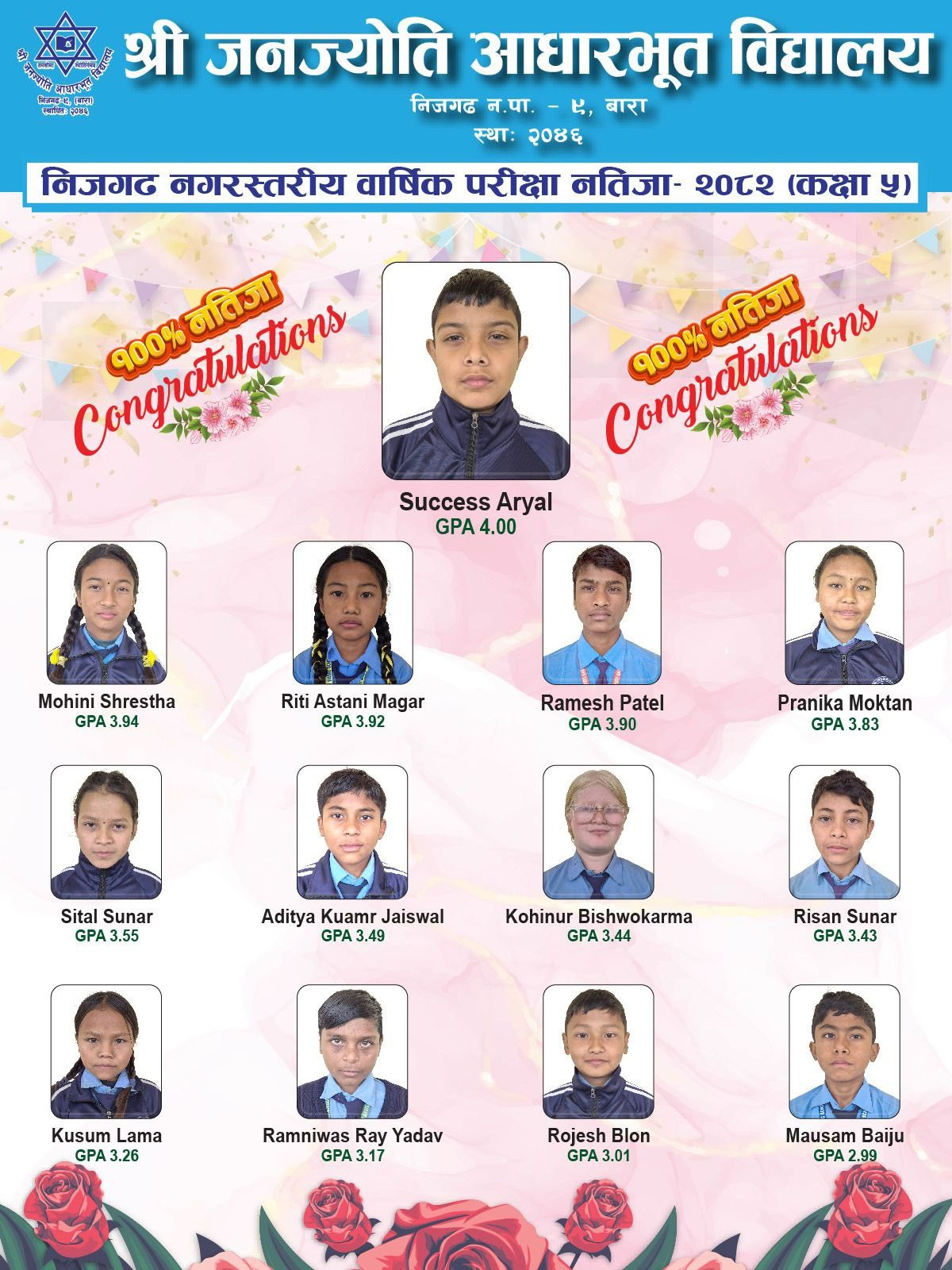 आधारभूत तह (कक्षा ५) को नतिजामा श्री जनज्योति आधारभूत विद्यालय निजगढकै उत्कृष्ट