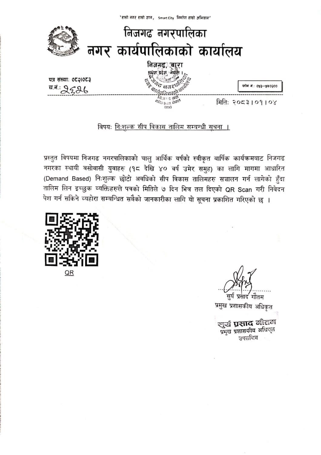 निजगढ नगरपालिकाद्वारा तालिममा सहभागि हुन चाहानेका लागि क्यूआर सार्वजनिक