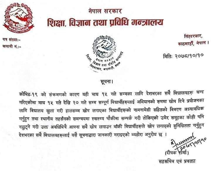 पछिल्लो समय कोरोना भाइरस संक्रमितको संख्या बढ्दै गएपछि सरकारले माघ १५ गतेसम्मका लागि विद्यालय बन्द गरेको थियो ।