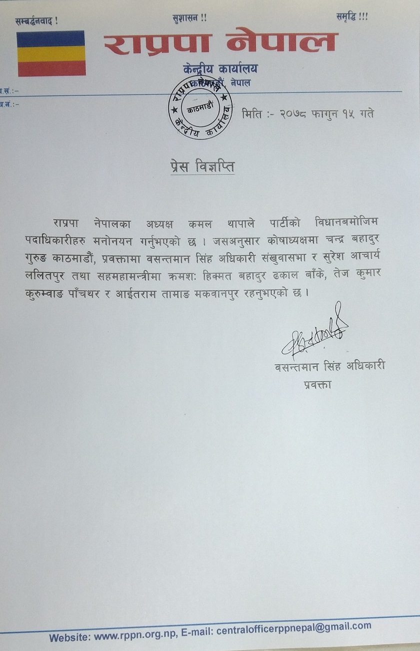 यस्तै प्रवक्तामा बसन्तमान सिंह अधिकारी र सुरेश आचार्य मनोनित हुँदा सहमहामन्त्रीमा हिक्मत बहादुर ढकाल, तेजकुमार कुरुम्बाङ र आइतराम तामाङ चयन भएका छन् ।