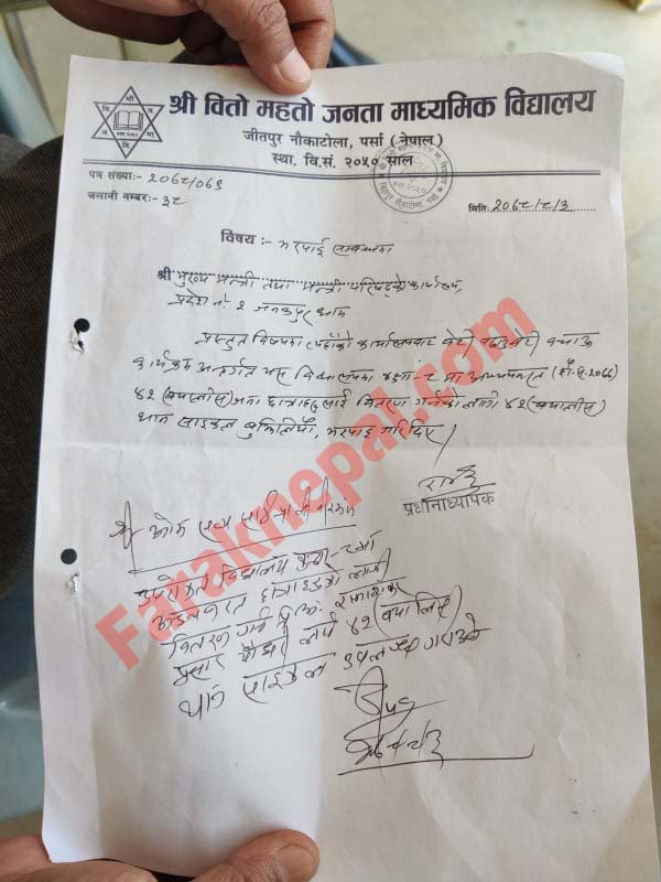 वीरगञ्ज। मधेश प्रदेशका मुख्यमन्त्री लालबाबु राउत गद्दीका स्वकीय सचिव दीपक यादवले विद्यालयसँग भरपाई लिएर साइकल वितरण नगरेको पाइएको छ ।