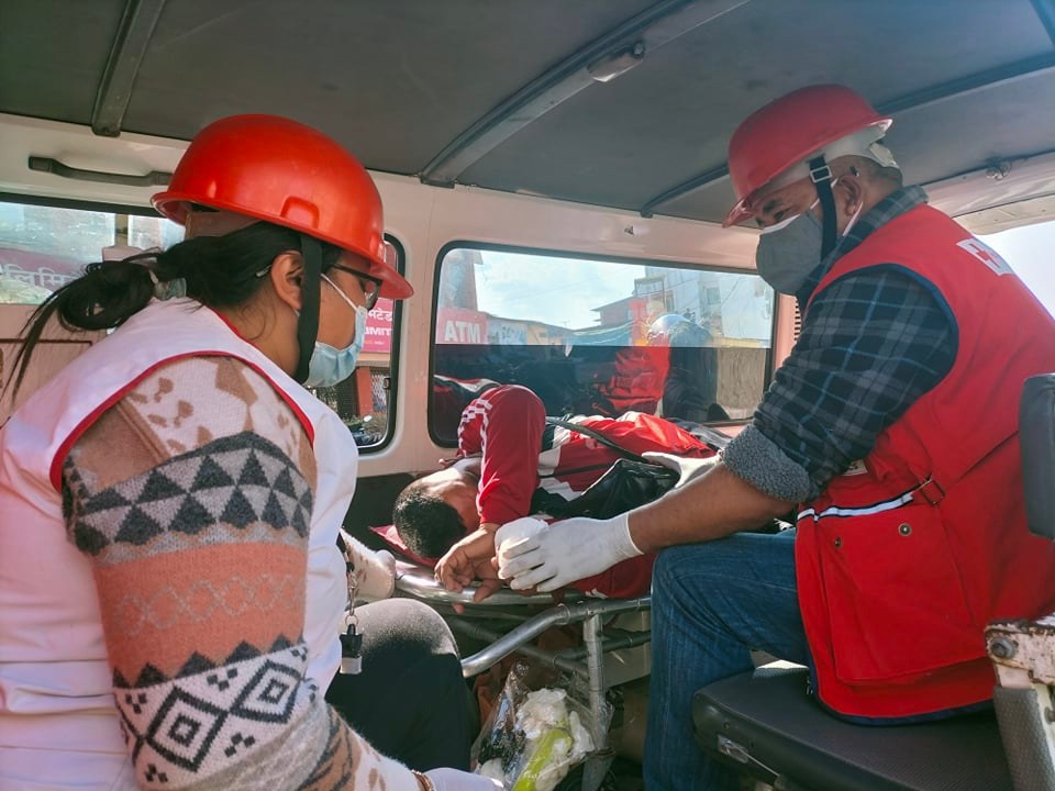 कुवरलाई नेपाल रेडक्रसकाे टाेलीद्वारा उद्धार गरेर अस्पतालतर्फ लगेकाे छ ।