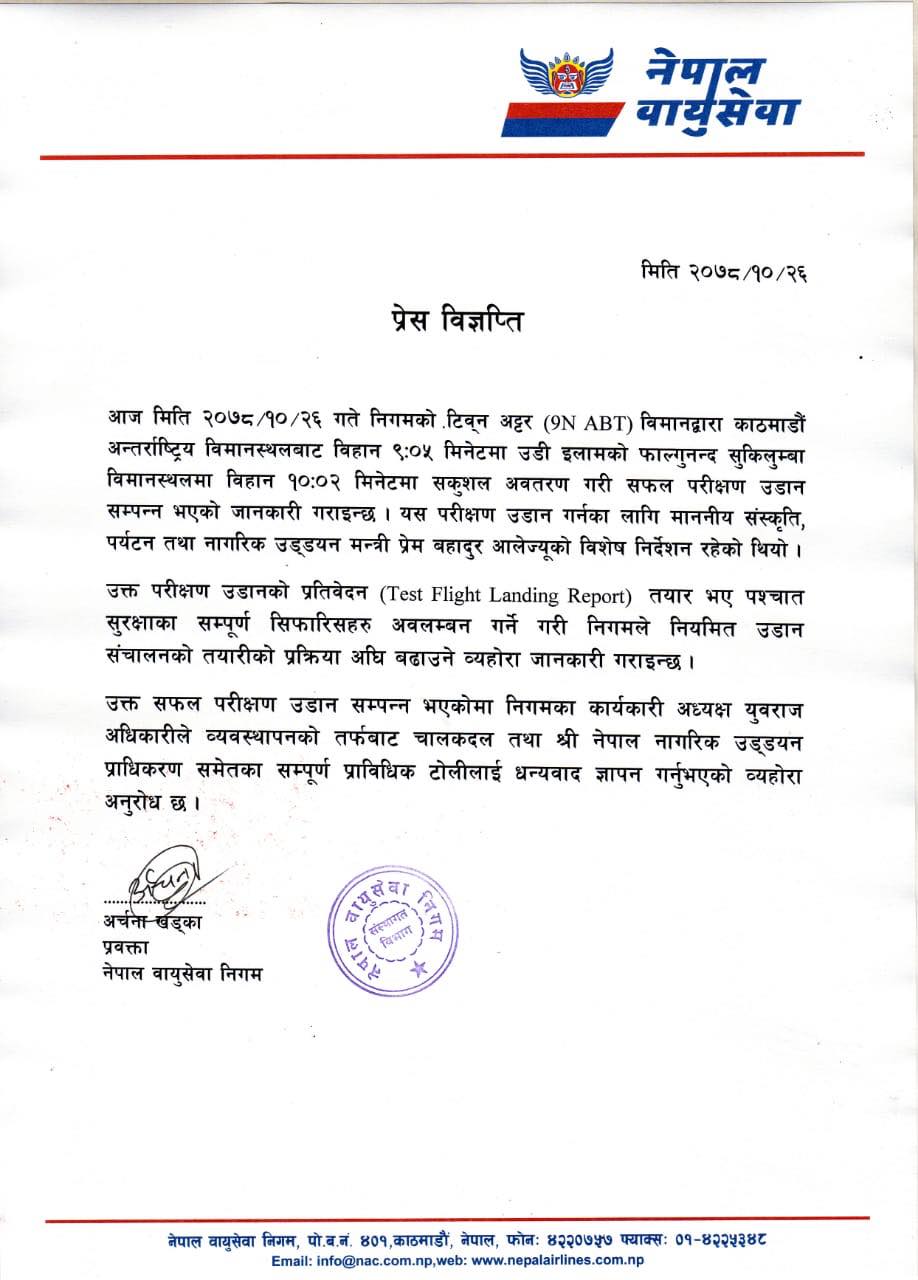 इलाममा नेपाल वायुसेवा निगमले गर्‍यो परीक्षण उडान