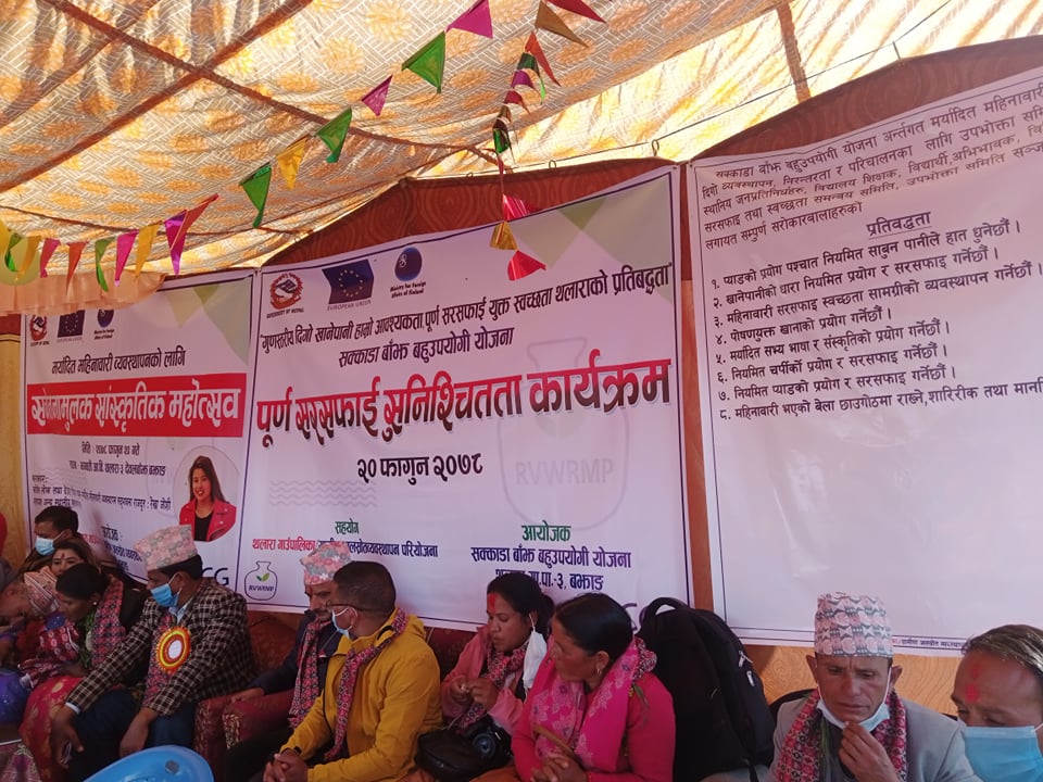 बझाङ । जिल्लाको थलरा गाउँपालिका ३ देबलबाँझमा मर्यादित महिनावारी व्यवस्थापनको लागि सचेतनामुलक साँस्कृतिक महोत्सव एवम् सक्काडाँ बाँझ बहुउपयोगी योजना पुर्ण सरसफाइ कार्यक्रम सम्पन्न भएको छ ।