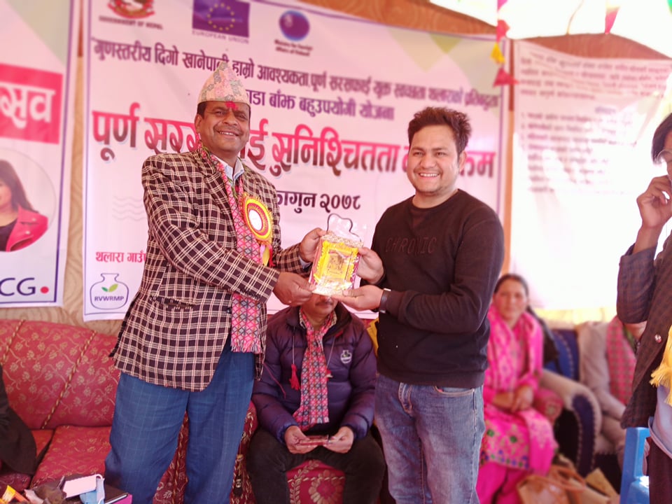ग्रामीण जलस्रोत व्यवस्थापन परियोजनाका टिमलिडर नारायण वाग्ले कार्यक्रम बोल्दै भन्नू भयो निर्माण गरिएको खानेपानी योजनाहरूलाई निरन्तरतारुपमा सञ्चालन गर्नुपर्ने परिवर्तन भएका बानी व्यवहारलाई निरन्तरता दिने, योजनाको संरक्षण गर्ने जिम्मेवारी स्थानीयको रहेको छ।