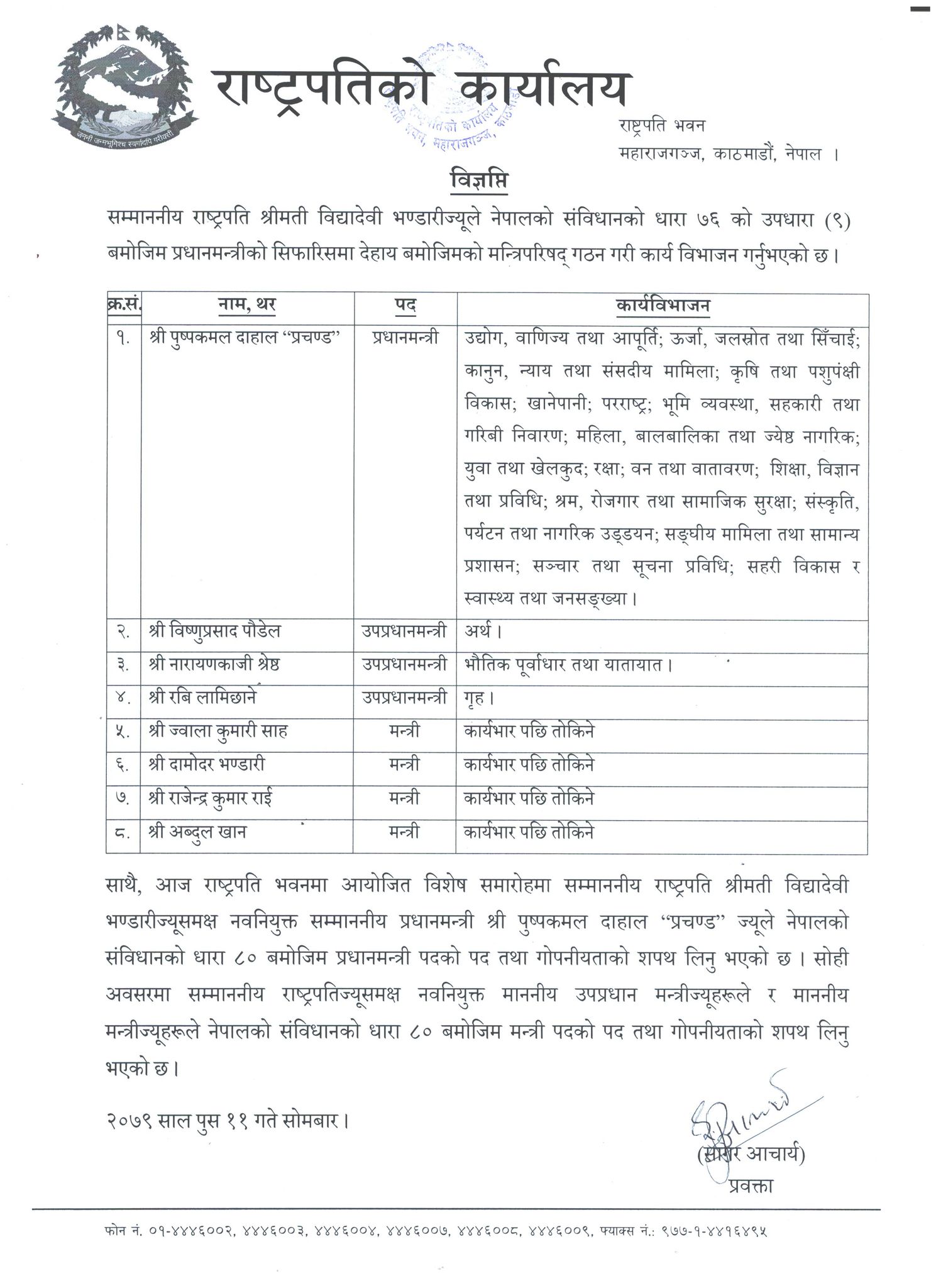 यस्तो छ मन्त्रीहरूको वरीयता, १८ मन्त्रालयको जिम्मेवारी प्रचण्डसँगै
