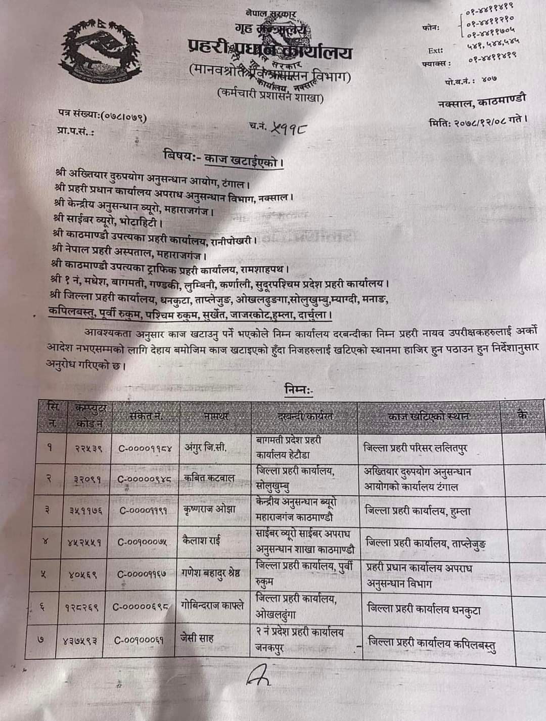 प्रहरी प्रधान कार्यालयका अनुसार दार्चुलामा प्रतीक विष्ट, हुम्लामा कृष्ण ओझा, जाजरकोटमा सन्तोष निरौला र मनाङमा प्रेम सागर केसीलाई पठाइएको छ । नियमित सरुवा गर्नुपर्ने अवधि पुगे पनि प्रधान कार्यालयले सरुवा छलेर शक्तिकेन्द्रको रोजाइका अधिकृतहरूलाई काजमा पठाएको छ । एक वर्षमा हुनुपर्ने प्रहरी अधिकृतहरुको सरुवा १८ महिनादेखि हुन सकेको छैन् । तर, प्रहरी महानिरीक्षक खनालले नियमित सरुवा गर्न सकेका छैनन् ।